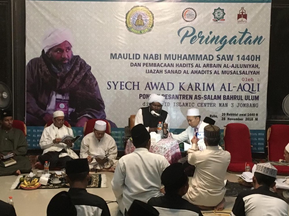 “Acara maulid kali ini kita isi dengan tausiyah dari Syeh Awad sekaligus nanti ada pembacaan Hadits Al-Arbain Al-Ajluniyah dan ijazah sanad Al-Hadits Al-Musalsaliyah dari beliau, kehadiran beliau ke Bahrul Ulum dalam rangka Dauroh Ma’ahid Indonesiy” terang KH. Syifa’ Malik, pengasuh ribath Al-Maliki 2 merangkap penasehat kegiatan. Sementara, H. M. Sutrisno, M.Pd Kepala MAN 3 Tambakberas yang turut hadir dalam acara, mengucapkan banyak terimakasih kepada dzuriyah. “Malam ini kita mendapat kehormatan yang sangat luar biasa, karena Islamic Center Al-Madinah yang kita miliki, dijadikan tempat kegiatan yang sangat membawa barokah dan manfaat bagi siswa-siswi dan guru-guru madrasah, ke depan kami berharap kegiatan ini bertempat di sini lagi, kami yakin, kegiatan seperti ini akan mampu menyinari rohani siswa dan guru”.
